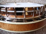 Tube and plate flange, Stewart MacDonald curly maple resonator, 3ply maple rim, bellbronze flathead tonering. Ebony fingerboard, top and back side peghead. Gotoh pegs.A,B,H,C,CIS,D,E,spikes (capo)for 5 string. Ivoroid Saga binding and wood purfling.